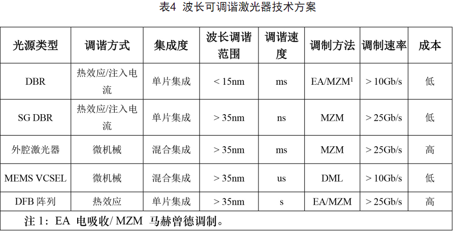 根據(jù)光源類型及調(diào)諧方式的不同,波長可調(diào)諧激光器存在多種技術(shù)方案,五種最典型的方案對(duì)比如表4所示?;谌庸鈻欧植疾祭穹瓷淦?SG-DBR)技術(shù)的激光器具有波長可調(diào)諧范圍寬、調(diào)諧速度快、調(diào)制速率高和成本相對(duì)較低等優(yōu)勢,是業(yè)界主流技術(shù)方案,受專利等限制,國內(nèi)量產(chǎn)能力有限。目前國內(nèi)基本具備DBR可調(diào)激光器的產(chǎn)業(yè)化能力,波長調(diào)諧范圍支持10nm量級(jí),一般可滿足20通道@100GHz波長間隔的應(yīng)用場景。另外,外腔激光器、微機(jī)電系統(tǒng)(MEMS) VCSEL、DFB陣列等方案因成本、穩(wěn)定性、工作帶寬和調(diào)諧時(shí)間等限制尚在進(jìn)一步研究中,尚不具備規(guī)模產(chǎn)業(yè)化能力。