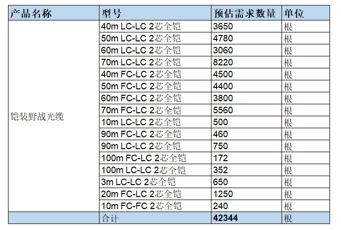 ICC訊 (編輯:Nicole) 安徽移動啟動2022-2023年度基站鎧裝野戰(zhàn)光纜選型項目(招標(biāo)編號:AHYD20220500223),需采購鎧裝野戰(zhàn)光纜共42344根,本項目不劃分標(biāo)包,最高投標(biāo)限價為433萬元(含稅)。詳細(xì)內(nèi)容及數(shù)量見下表:
