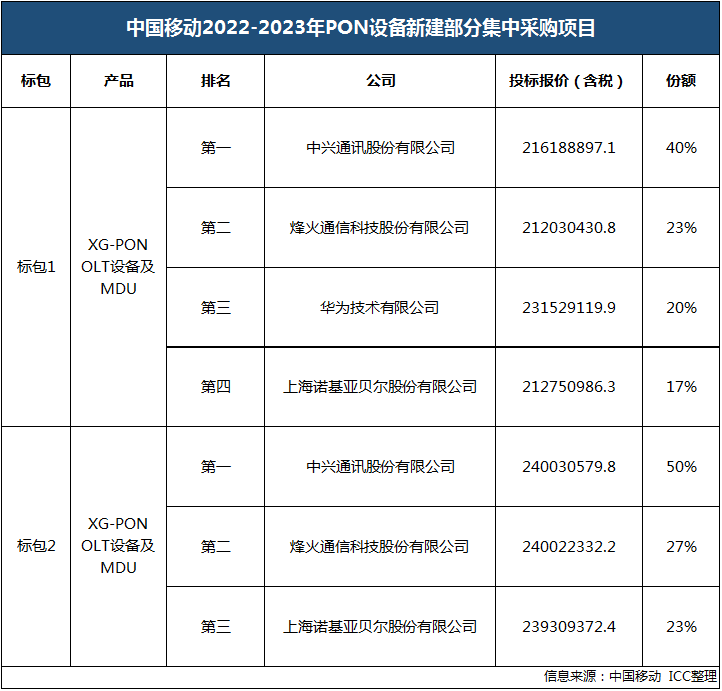 ICC訊 24日消息,中國移動公布2022-2023年P(guān)ON設(shè)備新建部分集采結(jié)果,中興通訊、烽火通信、華為和諾基亞貝爾成為中標(biāo)候選人,該項目涵蓋XG-PON/XGS-PON的OLT端和ONU端(MDU)設(shè)備,具體報價和份額如下: