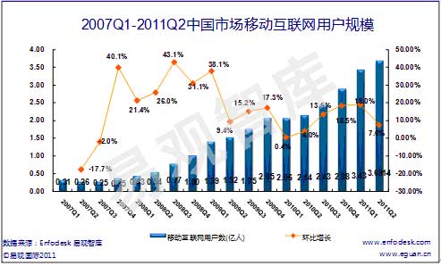 據(jù)易觀國(guó)際最新發(fā)布的數(shù)據(jù)顯示,2011年第2季度中國(guó)移動(dòng)互聯(lián)網(wǎng)用戶規(guī)模達(dá)3.69億人,環(huán)比增長(zhǎng)7.6%%,相比去年同期呈現(xiàn)72.3%增長(zhǎng)速度。