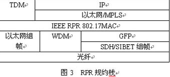 2000年11月IEEE 802.17工作組成立,目標(biāo)是開發(fā)彈性分組環(huán)(RPR)標(biāo)準(zhǔn),優(yōu)化在城域網(wǎng)拓?fù)洵h(huán)上的數(shù)據(jù)包傳輸;該技術(shù)結(jié)合以太網(wǎng)的實用性和SDH光傳輸設(shè)備的強大功能,利用空分復(fù)用,時分統(tǒng)計復(fù)用和保護環(huán)提高帶寬的利用率,實現(xiàn)了節(jié)點對網(wǎng)絡(luò)資源的合理利用,同時還支持業(yè)務(wù)分級(SLA),以及即插即用等特性,將城域網(wǎng)轉(zhuǎn)變?yōu)榭焖俸唵危煽?,并及時提供豐富增值服務(wù)的寬帶網(wǎng)絡(luò)。圖3示RPR規(guī)約棧。由圖可見RPR通過在環(huán)網(wǎng)上的媒體接入控制(MAC)規(guī)約解決了城域網(wǎng)的現(xiàn)存問題;使其既有以太網(wǎng)低成本,有效和簡單的特性,又有SDH傳輸技術(shù)的高可用性,靈活性,以及50ms環(huán)路保護的優(yōu)點;為網(wǎng)絡(luò)提供一種新的傳輸技術(shù);同時還能為不同的業(yè)務(wù)提供不同等級的QoS,滿足了建設(shè)城域網(wǎng)和廣域網(wǎng)對成本,性能以及維護管理的需要。