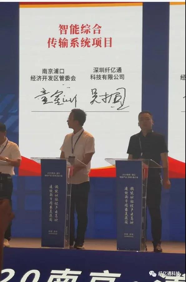 在項(xiàng)目簽約儀式上,南京浦口經(jīng)濟(jì)開發(fā)區(qū)管委會主任童金洲、深圳纖億通科技有限公司總經(jīng)理吳桐雙方代表簽署《智能綜合傳輸系統(tǒng)項(xiàng)目合作書》。