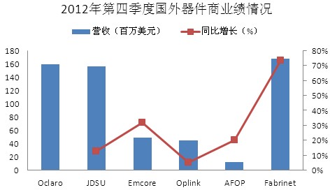 【訊石光通訊咨詢網(wǎng)】2012年第四季度國外器件商業(yè)績普遍向好,同環(huán)比差不多都實現(xiàn)了增長。