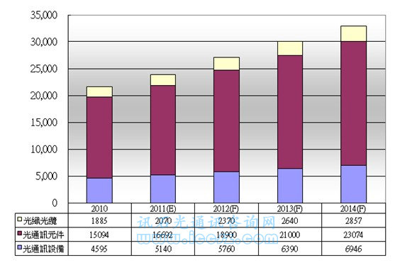 報(bào)告顯示,2011年臺灣光通訊產(chǎn)值估計(jì)為新臺幣239億200萬元,其成長率11%雖不若2010年的31%成長率,但在今年整體大環(huán)境不佳的情況,仍然算是令人驚艷。也預(yù)期在2010至2014年間,臺灣光通訊產(chǎn)業(yè)能以11%左右的平均復(fù)合年成長率持續(xù)成長。