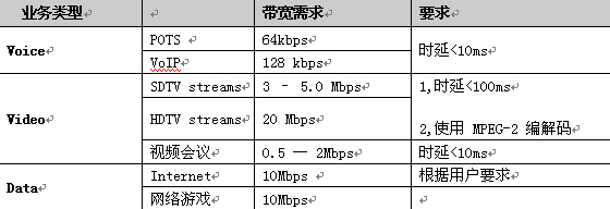 從表1中我們可以看到:針對不同的業(yè)務(wù),需要的帶寬不同。對服務(wù)質(zhì)量(QoS)以及服務(wù)等級(CoS)的要求也差異很大。