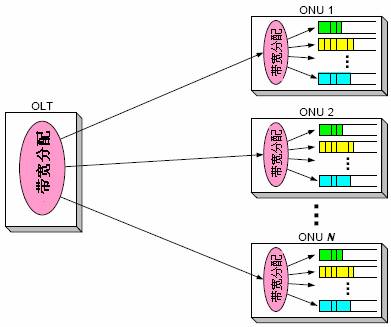 在這樣的配置中,OLT會分配給每個ONU一個不同的LLID。這樣的話,從帶寬分配機制上來說,將會變成一個分級的帶寬分配結(jié)構(gòu)。上層的OLT負責(zé)ONU的帶寬分配,根據(jù)ONU的請求和網(wǎng)絡(luò)現(xiàn)狀,分配給而每個ONU的一定的帶寬;而ONU根據(jù)自身業(yè)務(wù)種類和業(yè)務(wù)的要求,再進行帶寬分配。如圖2所示: