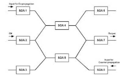 在反向傳輸(counter-propagation)結構中,預放大器會導致信號性能受限,如數(shù)據(jù)信號的增益受到壓縮以及在預放大器中CW激光器的XGM效應。所有這些問題都可以通過一個帶有干涉儀的SOA-MZI結構來得到解決(通過對輸入臂上的CW進行相消干涉解決)。