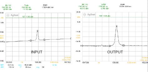 這樣就讓本地CW波長與輸入信號波長在干涉儀上產生了相長干涉(constructive interference),從而導致輸入數(shù)據(jù)的波長轉換,即從λ2轉變?yōu)棣?。由于本地CW具有很高的光譜純凈度,因此輸出光信噪比(OSNR)將得到有效改善,從一個受噪音影響的低OSNR輸入信號轉變成高信噪比的輸出信號,這樣導致信號的光譜得到再整形,參看圖2。而波長轉換和2R再生這兩項功能則是SOA-MZI的最主要應用。
