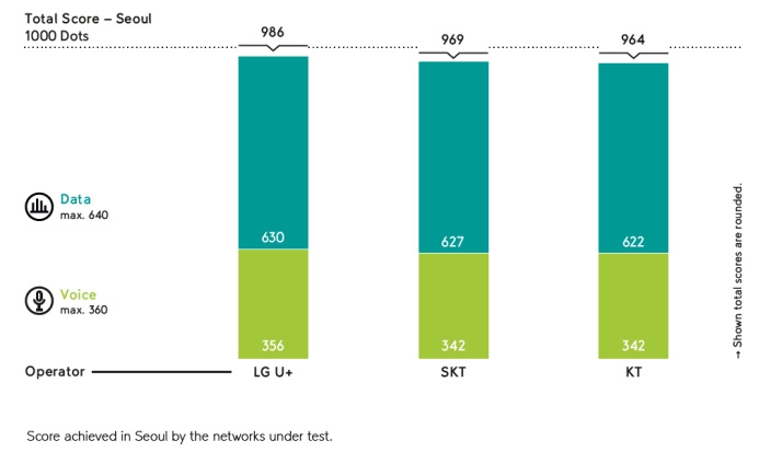 以平均下行為例,LG U+為1007Mbps,比KT的868Mbps高16%和比SKT的774Mbps好30%。