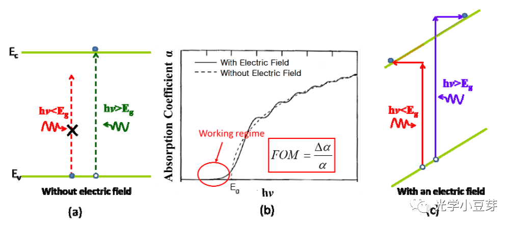 Ge材料在O波段和C波段都有較大的吸收系數(shù),這也是為什么硅光芯片中采用Ge作為光探測器。而Ge材料作為電吸收調(diào)制器,主要是基于Franz-Keldysh效應(yīng)(以下簡稱FK效應(yīng))。在外加電場作用下,能帶發(fā)生傾斜,使得有效的帶隙變小,價帶電子躍遷到導(dǎo)帶的幾率大大增加。