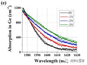 通過設(shè)計doing profile以及波導(dǎo)結(jié)構(gòu),使得光場與電場之間發(fā)生有效地交疊。文獻2中,零偏壓時的電場強度為9.8kV/cm, 而-2V時的電場強度變?yōu)?6kV/cm。其吸收譜曲線如下圖所示,電壓增大后,吸收系數(shù)增大(有點類似VOA)。