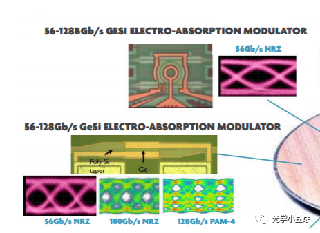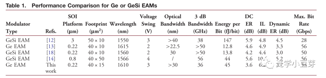 從上表可以看出,Ge EAM的尺寸非常小,長度只需要幾十微米,工作波長在1550nm以上,其工作電壓在3V左右,3dB帶寬可以達(dá)到56GHz,功耗較低。因此小豆芽覺得,對于大規(guī)模集成光路,對單個器件的尺寸與功耗要求比較高,此時EAM或許有用武之地。