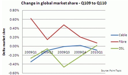 2010年第一季度是進入2009年以來寬帶用戶數(shù)量增長最快的一個季度,該季度增長1470萬線,季度增長3.12%。截止2010年3月31日,全球?qū)拵в脩魯?shù)量達到了4.84億。Point Topic最新數(shù)據(jù)顯示.