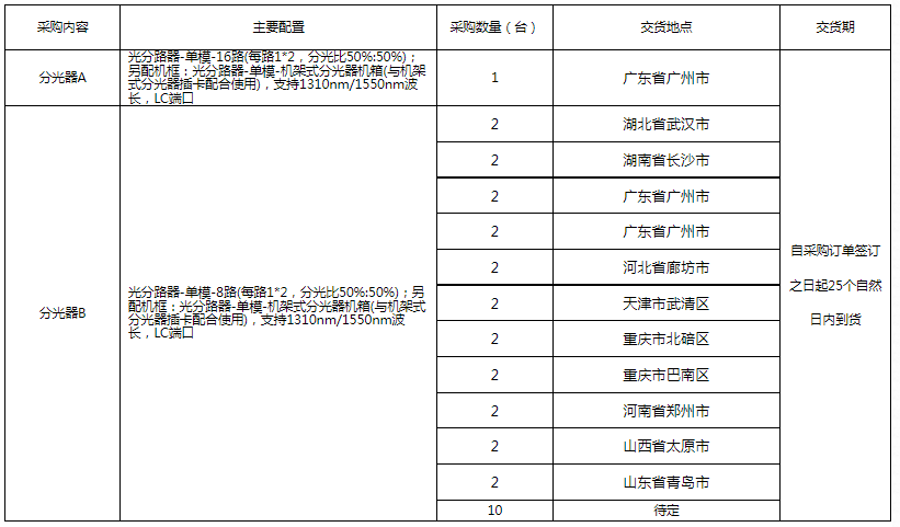 ICC訊 中國(guó)電信啟動(dòng)天翼云2022年多節(jié)點(diǎn)擴(kuò)容工程分光器采購(gòu)項(xiàng)目,擬采購(gòu)用于多節(jié)點(diǎn)擴(kuò)容工程的分光器,數(shù)量為33臺(tái)。本次采購(gòu)的主要配置、采購(gòu)數(shù)量、交貨地點(diǎn)及交貨期,具體如下: