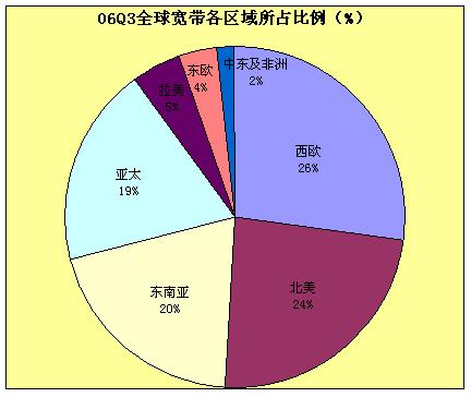 Point Topic最新的世界寬帶統(tǒng)計(jì)報(bào)告指出,東歐在2006年第3季為全世界寬帶成長(zhǎng)率最高的地區(qū)。相對(duì)而言中東與非洲地區(qū)為較不成熟的市場(chǎng),成長(zhǎng)速度也相當(dāng)快。拉丁美洲表現(xiàn)也相當(dāng)亮眼。西歐以及東南亞是唯二成長(zhǎng)率衰退的地區(qū)。