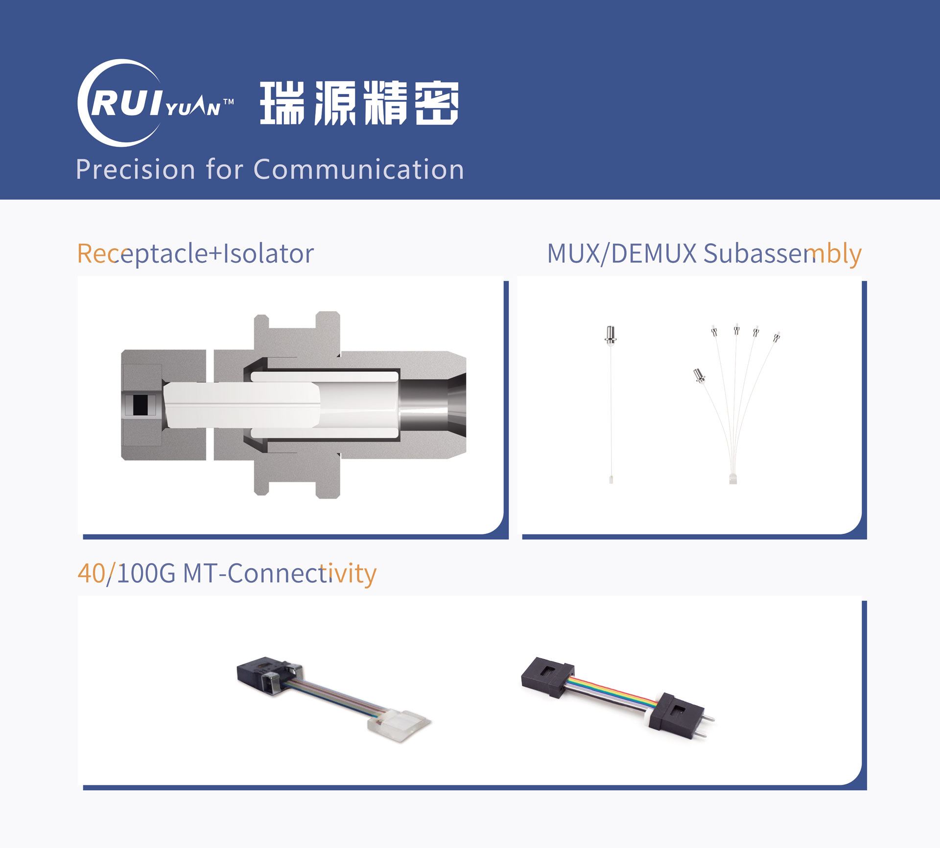 隨著接入網(wǎng)升級擴容、數(shù)據(jù)中心速率提升以及未來5G網(wǎng)絡(luò)建設(shè),驅(qū)動新的一輪基礎(chǔ)設(shè)施投資,高速光模塊市場規(guī)模不斷擴大,光組件需求也跟著水漲船高,瑞源精密在2015年成立光組件事業(yè)部,專門研發(fā)、設(shè)計和制造各類型光模塊內(nèi)部OSA/COB/BOX工藝的光組件(Receptacle),包括常規(guī)組件、帶隔離器組件、MT組件、Mini式組件、尾纖組件等。