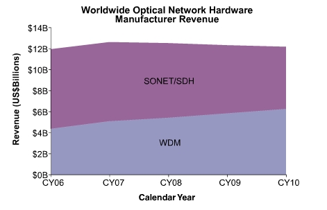 該機(jī)構(gòu)的首席分析家MichaelHoward認(rèn)為,在光網(wǎng)絡(luò)設(shè)備市場(chǎng),SONET/SDH設(shè)備的壟斷地位已經(jīng)保持了很長(zhǎng)的時(shí)間,但是自從2002年起,運(yùn)營(yíng)商在WDM設(shè)備上的投資開始逐年增長(zhǎng)。事實(shí)上,2006年的第四季度,WDM光設(shè)備銷售額增長(zhǎng)了18,而SONET光設(shè)備銷售額下滑了18。在2002年,WDM設(shè)備在整個(gè)光網(wǎng)絡(luò)硬件市場(chǎng)的份額為30%,而SONET/SDH為70%,不過八年之后,也就是2010年,預(yù)計(jì)WDM光網(wǎng)絡(luò)設(shè)備的開支將開始首次超過SONET/SDH設(shè)備。