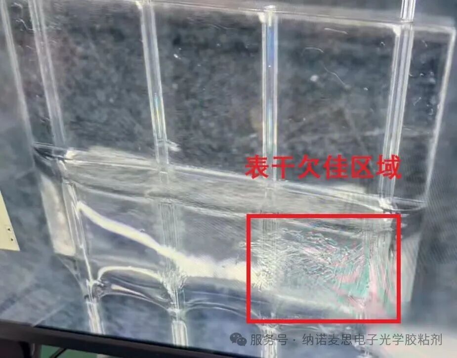 基于之前的經(jīng)驗,他們的這款尾膠“表干性能”欠佳,這是發(fā)生了UV膠常見的氧阻聚現(xiàn)象。