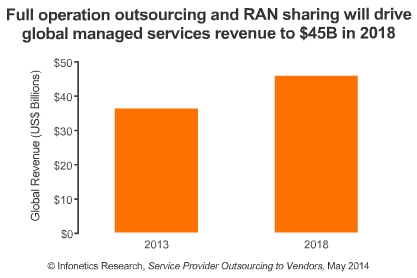 *外包市場的管理服務部分包括:網絡維護、運營和規(guī)劃設計,其2013年增長6%,至360億美元,Infonetics預測其2018年將達450億美元。