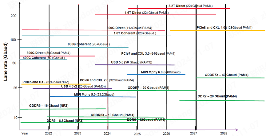 1.6T光模塊產(chǎn)品理論上依據(jù)IEEE P802.3dj協(xié)議設(shè)計,但由于該協(xié)議尚未正式發(fā)布,因此各廠商目前依據(jù)行業(yè)共識,采用8路100~112G Baud PAM4信號的方式實現(xiàn),即每路信號速率為200~224Gbps。1.6T光模塊在今年已經(jīng)進入樣品階段,有望在明年逐步具備商用條件。