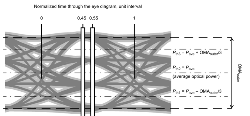 OMA(Outer Optical Modulation Amplitude)外部光調(diào)制幅度指的是在規(guī)定的測試碼型中,7個連“3” 和6個連“0”的中心兩個UI上測量的電平值P3和P0的差值,即OMA=P3-P0。而消光比OER(Outer Extinction Ratio)也是基于這兩個電平值計算得到的,OER=P3/P1。