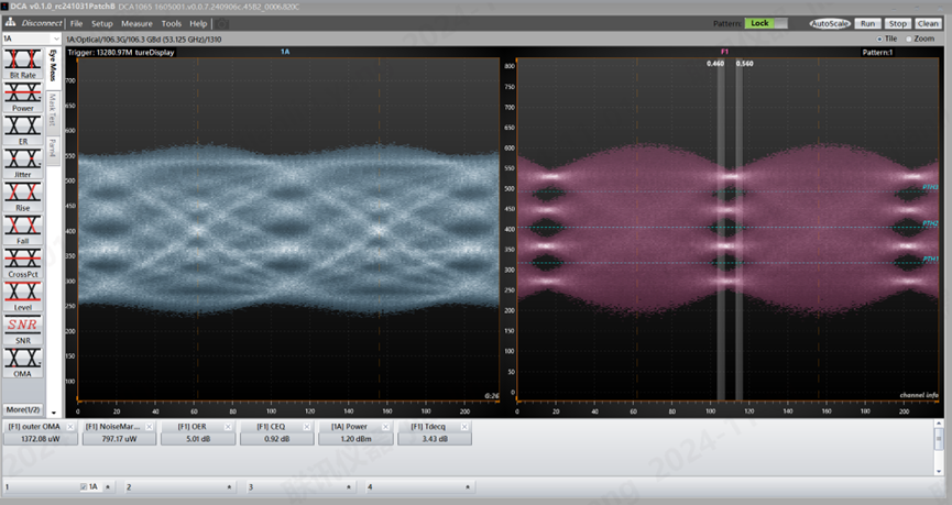 在1.6T測試應(yīng)用中,聯(lián)訊儀器DCA1065采樣示波器最多支持4路100GBd PAM4信號的眼圖測試。聯(lián)訊儀器提供一款上位機軟件(GUI)用于連接儀表和執(zhí)行具體測試,該GUI軟件支持的PAM4測試指標(biāo)如下: