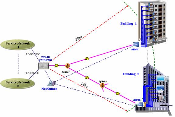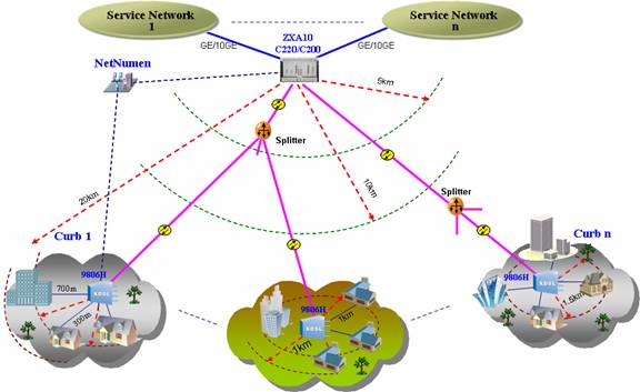 在FTTC和FTTCab模式下,采用ZXDSL 9806H來進行用戶差異化區(qū)別覆蓋,如1km或500米半徑范圍內(nèi)提供不同帶寬,OLT和MDU的距離最遠可以達到20km。由于ZXDSL 9806H具備室外安裝條件,可以放在小區(qū)的綠化帶里或者壁掛在桿上以節(jié)省網(wǎng)絡建設成本。
