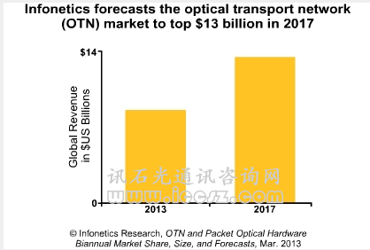 【訊石光通訊咨詢網(wǎng)】來自Infonetics研究的最新報告顯示,2012年OTN傳輸和交換設備市場增長8%至73億美元。增長主要來自OTN交換細分市場,該市場在2012年的增幅高達46%。Infonetics預計到2017年OTN設備市場將增長至130億美元。