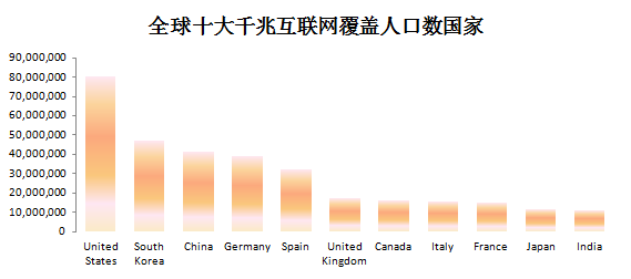 分國家來看,美國仍然是千兆互聯(lián)網(wǎng)人口覆蓋數(shù)最多的國家,現(xiàn)有超過8048萬人可以連接千兆寬帶。其次是韓國的4692萬,中國的4125萬、德國的3882萬和西班牙的3245萬。目前覆蓋人口數(shù)上千萬的國家有11個(gè)。除了前五大之外,還有英國、加拿大、意大利、法國、日本和印度。