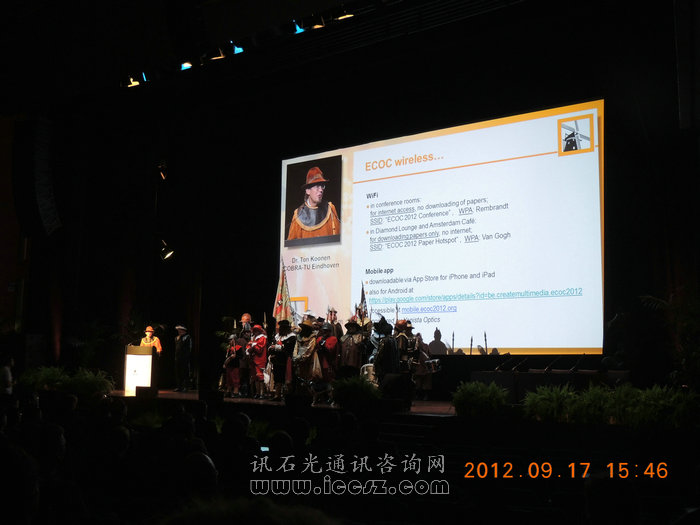 本次展會所在地AMSTERDAM RAI展館,本屆ECOC展在第一層,所以相比往年還有兩層的展館,今年的展覽面積似乎縮小了。展館遠(yuǎn)望去都是玻璃結(jié)構(gòu)為主,真正的用途卻是“節(jié)能、環(huán)保”,在展館開放的時(shí)候,館內(nèi)的燈光逐步暗下來,整個展館借助屋頂?shù)牟A?,利用太陽光來照明,非常環(huán)保。尤其到中午時(shí)分,絲絲陽光灑落下來,整個展館既明亮又溫暖。 參加ECOC2012開幕式,給人耳目一新的感覺,這在國內(nèi)是不多見的,沒有場面宏大的典禮現(xiàn)場,也沒有衣著正式的干部領(lǐng)導(dǎo),在舞臺上開幕的主持人著裝是如此“怪異”,舞臺后的團(tuán)隊(duì)是開幕表演的皇家樂隊(duì)。但這樣的開幕似乎更吸引人眼球,而關(guān)于展會的實(shí)用信息(展館介紹,研討會安排,無線網(wǎng)絡(luò)使用等)一應(yīng)俱全,一一介紹。