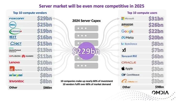 2024年,由于投資的高度集中,這一年對于服務(wù)器市場而言格外獨(dú)特。Omdia預(yù)測,前10家用戶公司就幾乎占據(jù)了全球服務(wù)器采購額的60%,前十家服務(wù)器廠商則滿足了超過70%的市場需求。