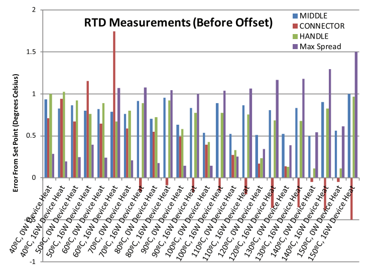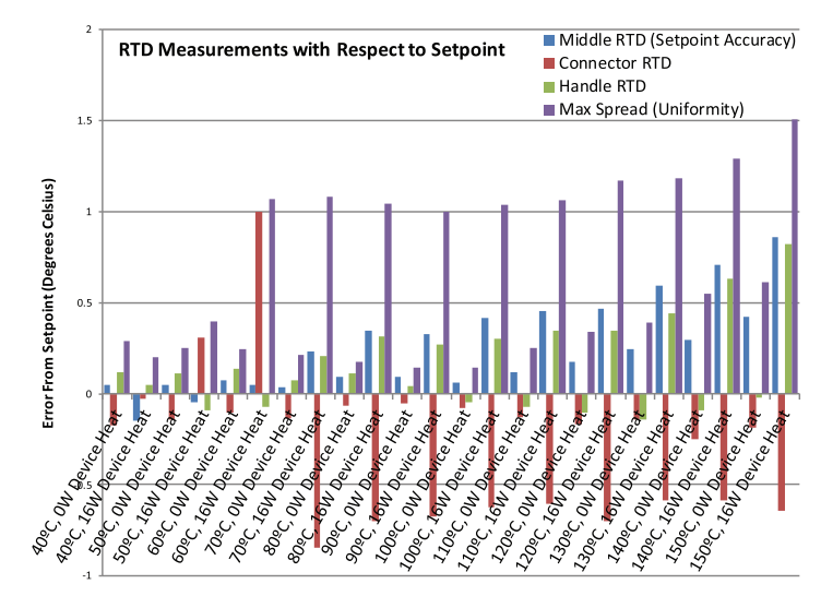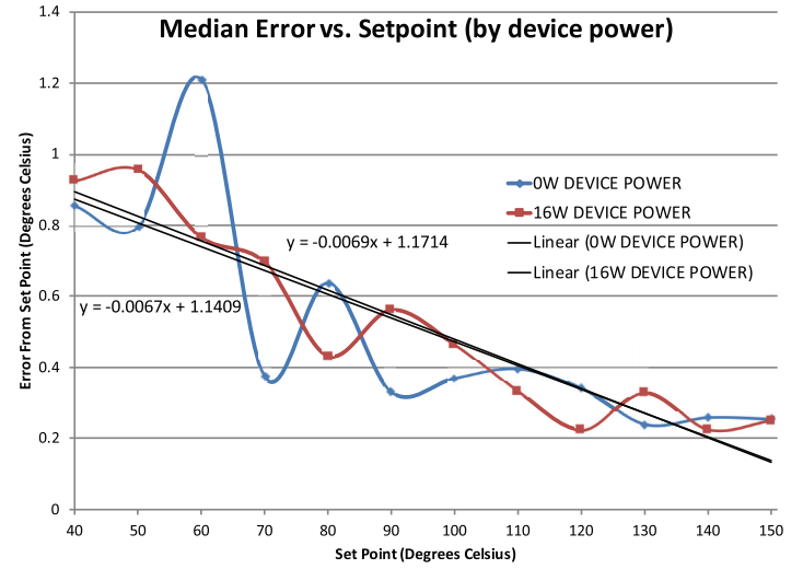 當溫度設置點以10度的增量從40°C向150°C變化時,位于上述三個位置的夾具加熱板溫度都被實時監(jiān)測。在每一溫度設置點,總的器件廢熱在0-16 W之間變化。在任一條件和位置,實際溫度會與設置溫度作比較。