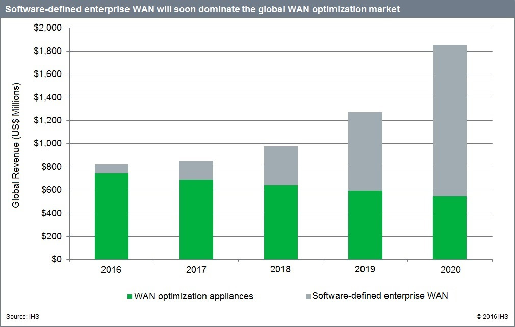 IHS分析師預計到2018年,SD-WAN市場發(fā)展速度將會放緩,隨后到2020年會有更多的企業(yè)采用SD-WAN。預計到2020年,將會占到廣域網優(yōu)化收入的71%。