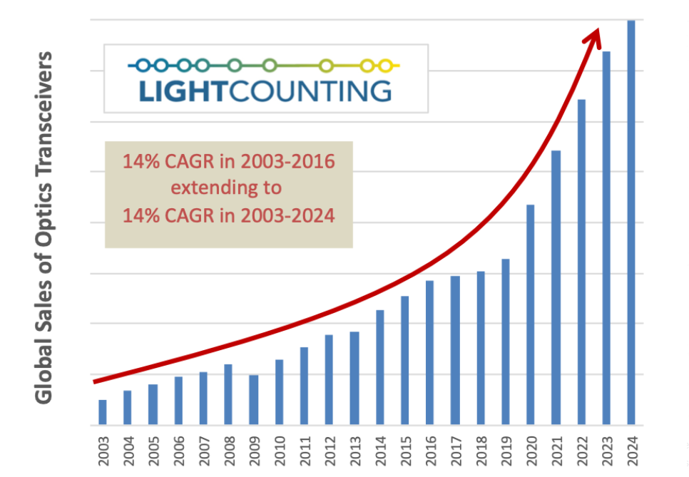 ICCSZ訊(編譯:Aiur)LightCounting發(fā)布最新光通信市場(chǎng)預(yù)測(cè)報(bào)告,指出2017-2018年的全球光收發(fā)模塊市場(chǎng)在經(jīng)歷連續(xù)兩年的低于預(yù)期增長(zhǎng)之后,2019年極有可能將是又一個(gè)低增長(zhǎng)的年份。但是,2003-2024年間的20年市場(chǎng)CAGR達(dá)到14%,如下圖1所示,這種增長(zhǎng)的推動(dòng)因素又是什么?