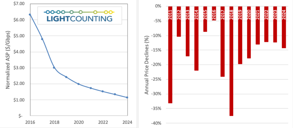 圖2 | 以太網(wǎng)光收發(fā)模塊的標(biāo)準(zhǔn)化ASP和平均價(jià)格的年度下降