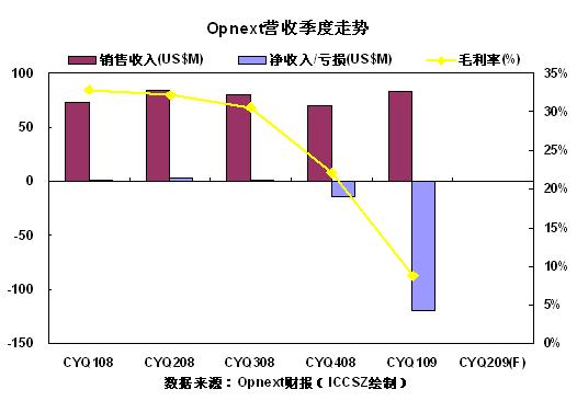 銷售收入為8360萬美元,相比上個季度的7050萬美元,增長率為18.6%,跟去年同期的7270萬美元相比,該季度銷售收入增長了15.0%。這個季度銷售收入包含了Opnext在2009年1月9日收購的StrataLight Communication公司3780萬美元的收入。