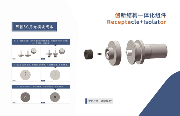 基于對(duì)精密技術(shù)的豐富理解,公司推出創(chuàng)新結(jié)構(gòu)Receptacle+Isolator一體化組件,該創(chuàng)新專利產(chǎn)品可以節(jié)約芯片材料成本,提高入射角可靠性以及減少光路溢膠風(fēng)險(xiǎn)。