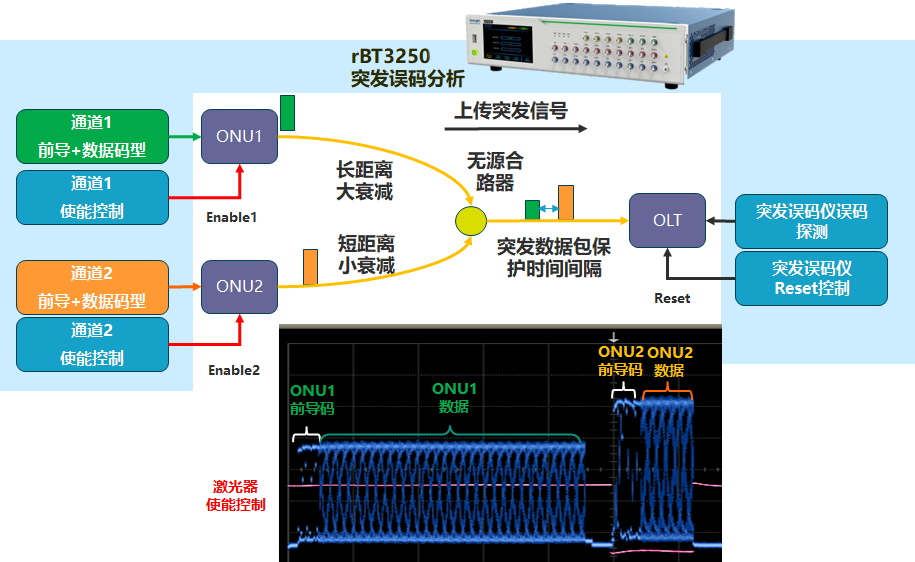 如圖a所示,搭建50G PON 突發(fā)測試環(huán)境,主要由兩個ONU模塊和一個OLT模塊組成。突發(fā)誤碼測試儀兩個突發(fā)通道PPG時分交替發(fā)送具備突發(fā)幀結(jié)構(gòu)的數(shù)據(jù)(preamble & Data)及激光器使能信號(enable),使兩個ONU模塊交替發(fā)送突發(fā)數(shù)據(jù),分別經(jīng)過衰減器,模擬不同長度光纖上的功率衰減,經(jīng)過分光路器合成一路光,接入OLT模塊。突發(fā)誤碼測試儀ED向OLT發(fā)送reset信號并接收突發(fā)數(shù)據(jù),進行兩路突發(fā)誤碼比較。