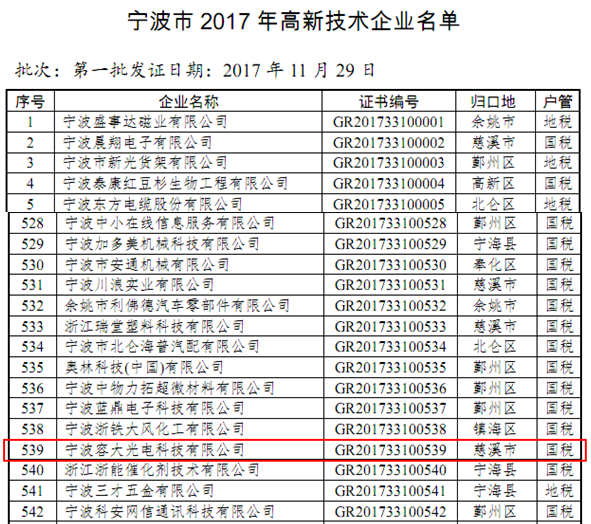 Iccsz訊 近日,據(jù)寧波政務(wù)公開網(wǎng)消息,寧波市2017高新技術(shù)企業(yè)名單出爐,寧波容大光電科技有限公司成功上榜。