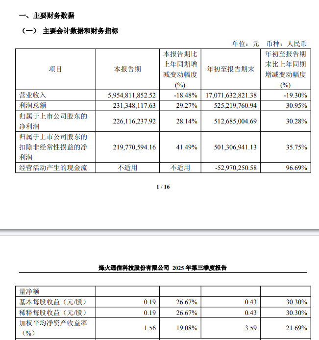 ICC訊 10月29日,烽火通信披露2025年三季報(bào)。烽火通信2025年第三季度實(shí)現(xiàn)營收59.55億元,同比下降18.48%;歸母凈利潤2.26億元,同比增長28.14%。2025年前三季度營收達(dá)170.72億元,同比下降19.30%;歸母凈利潤5.13億元,同比增幅達(dá)30.28%。