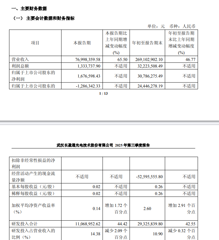 ICC訊 長(zhǎng)盈通 10月30日披露2025年第三季度報(bào)告。2025年前三季度公司實(shí)現(xiàn)營(yíng)業(yè)總收入2.69億元,同比增長(zhǎng)46.77%;歸母凈利潤(rùn)3078.63萬(wàn)元,同比扭虧;扣非凈利潤(rùn)2444.63萬(wàn)元,同比扭虧。公司指出,營(yíng)收及利潤(rùn)雙增長(zhǎng)主要得益于光纖環(huán)器件訂單交付量的大幅增加,同時(shí)去年確認(rèn)的長(zhǎng)飛光纖1000萬(wàn)元保證金損失本期未再發(fā)生。