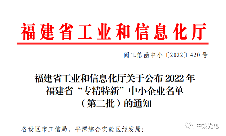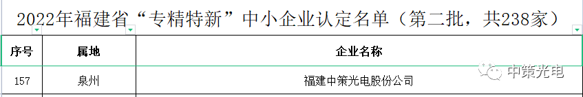 福建省工業(yè)和信息化廳公布了2022年福建省“專精特新”中小企業(yè)名單(第二批),中策光電名列其中,編號157。