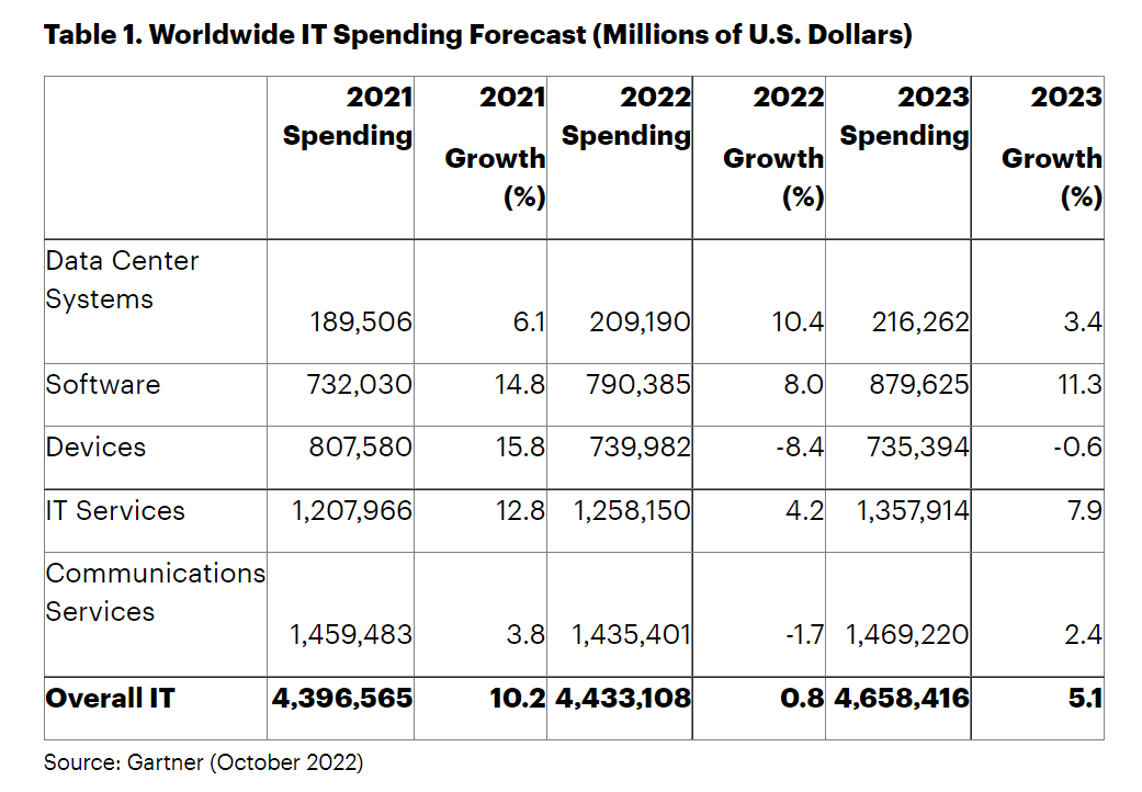 ICC訊 根據(jù)Gartner的最新預測,2023年全球IT支出預計將達到4.6萬億美元,比2022年增長5.1%。企業(yè)推動數(shù)字業(yè)務計劃以應對經(jīng)濟動蕩,2023的IT需求預計將更加強勁。