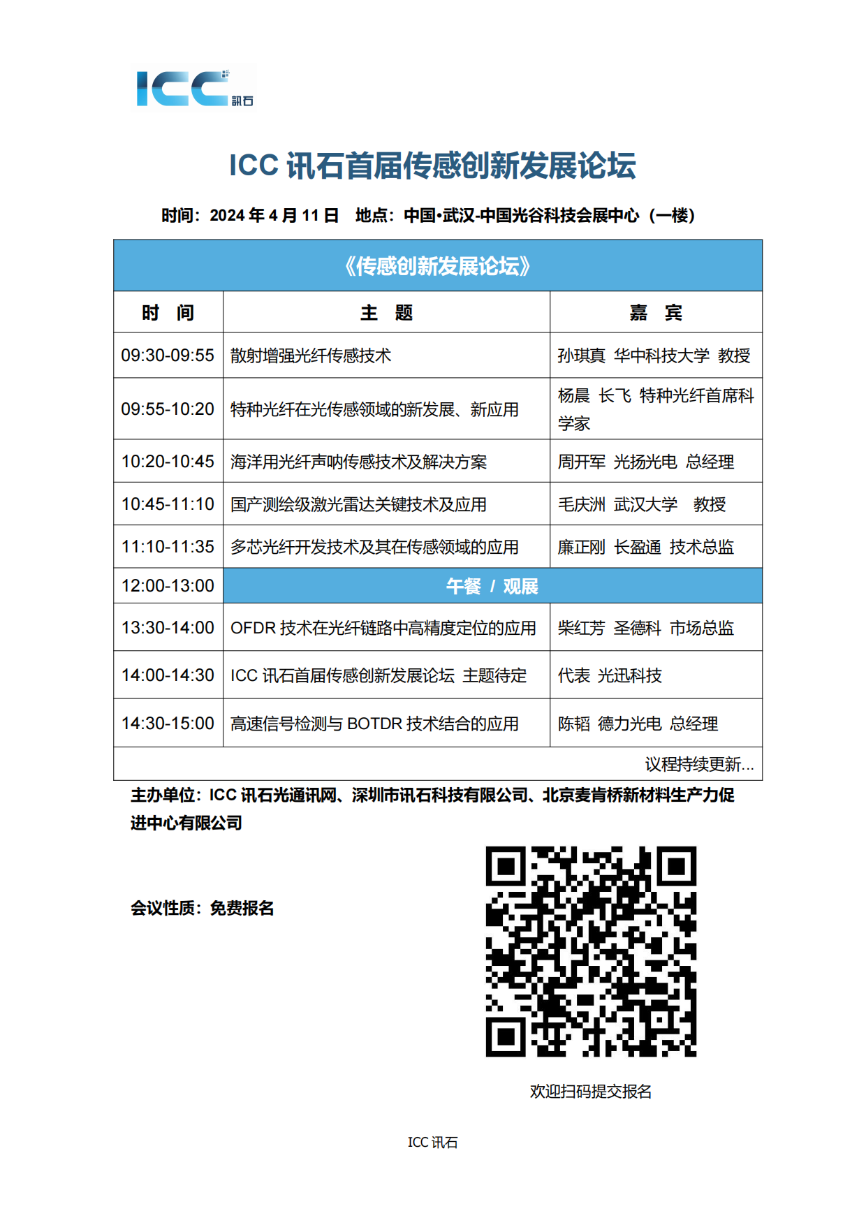 ICC訊 4月11日,由訊石公司、北京麥肯橋公司主辦的傳感創(chuàng)新發(fā)展論壇將在武漢中國光谷科技會(huì)展中心舉辦。本次訊石將邀請大學(xué)院校、研究院、傳感企業(yè)、測試設(shè)備企業(yè)共同參與,探討光纖傳感技術(shù)與市場的創(chuàng)新應(yīng)用與前景。