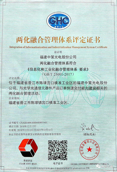 中策光電將以此次兩化融合管理體系認(rèn)證為契機(jī),持續(xù)加強(qiáng)與戰(zhàn)略匹配的信息化環(huán)境下的新型能力,快速推進(jìn)兩化融合進(jìn)程,為公司打造“信息化+”、實(shí)現(xiàn)強(qiáng)企夢(mèng)想貢獻(xiàn)力量。
