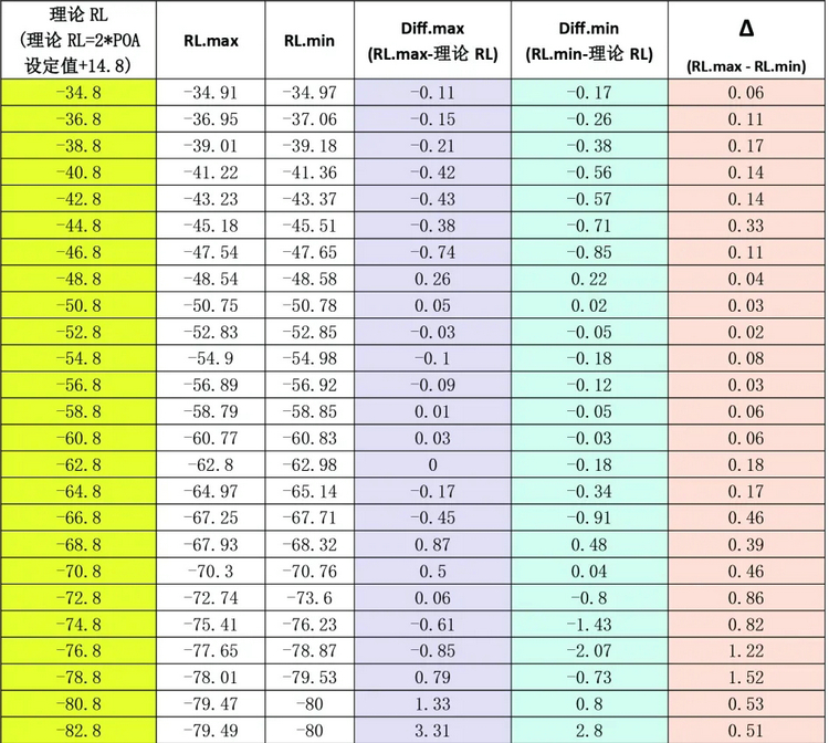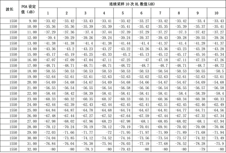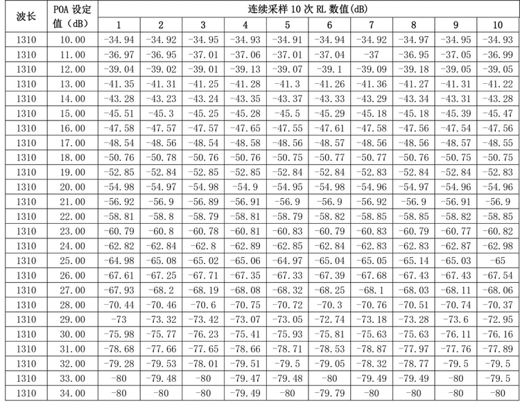 被測(cè)標(biāo)準(zhǔn)線的回?fù)p值RL=-14.8dB,調(diào)節(jié)衰減器POA,按設(shè)定衰減量逐步增大衰減值,記錄設(shè)定的每個(gè)衰減值以及連續(xù)讀取10次測(cè)量RL值,計(jì)算測(cè)量值Δ (RL.max - RL.min),并進(jìn)行數(shù)據(jù)分析。實(shí)驗(yàn)過(guò)程如以下視頻所示。我們分別對(duì)1310nm和1550nm波長(zhǎng),設(shè)定POA衰減值遞增,分別讀取 10次測(cè)量 RL值。