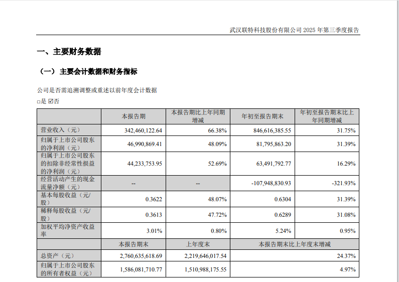 ICC訊 聯特科技發(fā)布2025年第三季度報告稱,2025年第三季度公司實現營業(yè)收入3.42億元,同比增長66.38%;歸屬于上市公司股東的凈利潤為4699萬元,同比增長48.09%。2025年前三季度公司實現營業(yè)總收入8.47億元,同比增長31.75%;歸母凈利潤8179.59萬元,同比增長31.39%。