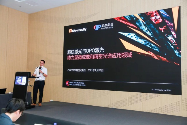 ICC訊 9月18日,英國國際貿(mào)易部組織“英國光電日-非凡創(chuàng)新助力可持續(xù)未來” 英國光電企業(yè)亮相CIOE,分享前沿技術(shù),探討光電創(chuàng)新如何助力可持續(xù)發(fā)展。富泰科技為英國著名超快激光器與光學參量振蕩器(OPO)中紅外激光器廠商Chromacity Lasers Ltd中國區(qū)域代表受邀參加和做報告,富泰科技工業(yè)與科研產(chǎn)品總監(jiān)王沛和產(chǎn)品經(jīng)理吳應(yīng)發(fā)參加此次的英國光電日會議。富泰科技工業(yè)與科研產(chǎn)品總監(jiān)王沛做“超快激光與OPO激光 - 助力顯微成像和精密光譜應(yīng)用領(lǐng)域”主題報告。