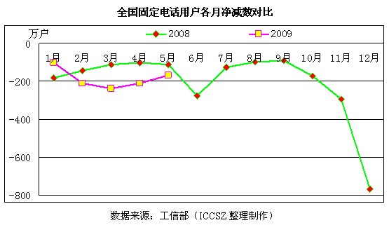 2009年1~5月,全國(guó)固定電話(huà)用戶(hù)減少927.0萬(wàn)戶(hù)(其中無(wú)線(xiàn)市話(huà)用戶(hù)減少800.7萬(wàn)戶(hù)),用戶(hù)總數(shù)降至3.32億戶(hù);其中,在前三個(gè)月,固話(huà)用戶(hù)流失速度不斷加快,從四月份開(kāi)始,用戶(hù)流失速度有所減慢,五月的用戶(hù)流失數(shù)進(jìn)一步降低,凈流失量降至167.5萬(wàn)戶(hù)。