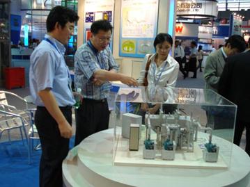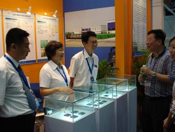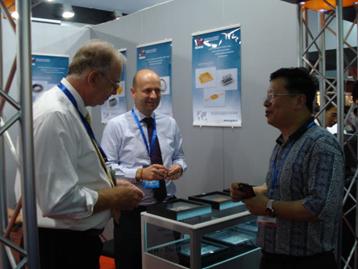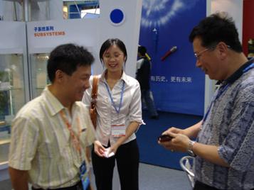 石總與華潤通總經(jīng)理鐘文欽(左二)、上海上詮副處長韓鳳永(右一)在上海上詮展臺前合影